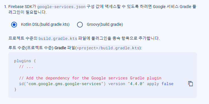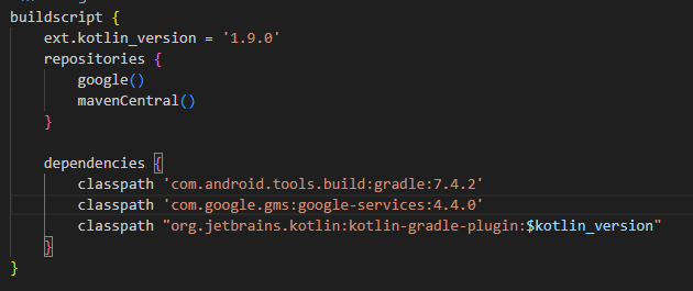 다음과 같이 classpath 'cohttp://m.google.gms:google-services:4.4.0' 를 추가해준다.