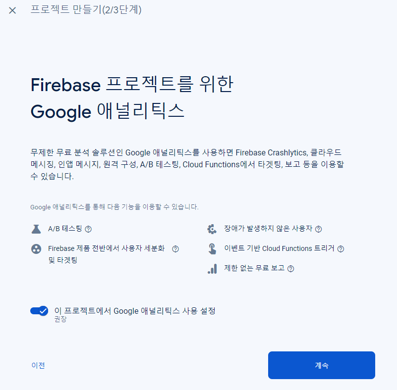 이렇게 하면 Firebase의 기본 설정이 끝났다.