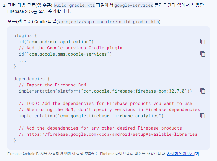apply plugin: 'cohttp://m.google.gms.google-services' 를 추가해준다.