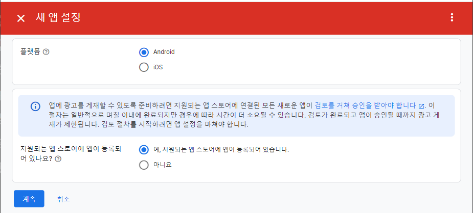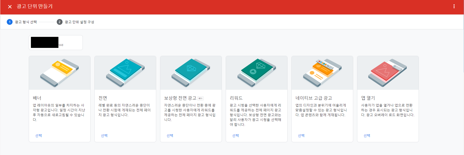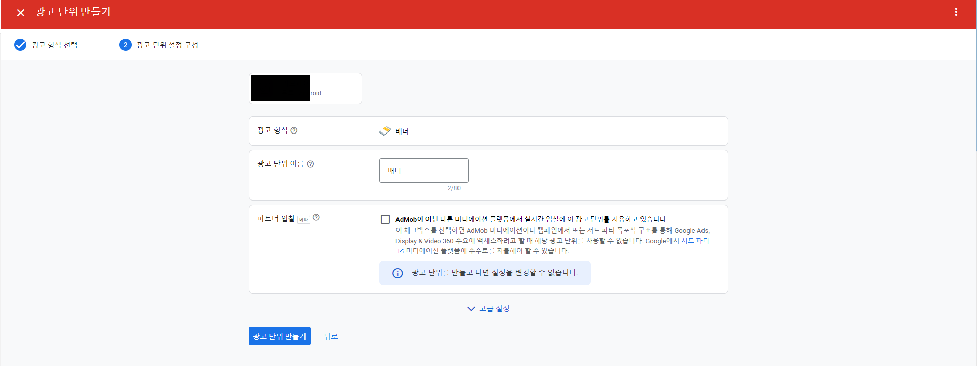 광고단위의 광고단위 추가 버튼을 클릭 하여 광고단위 만들기 화면을 연다