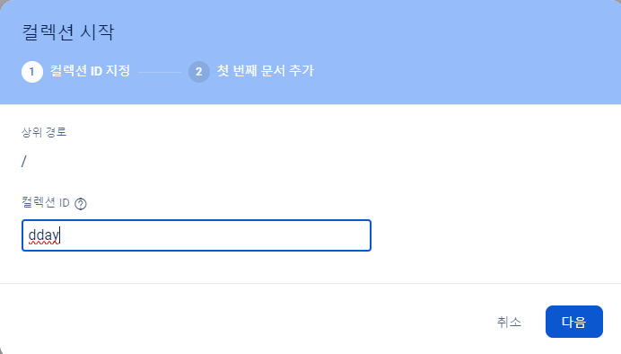 테이블 명과 같은 컬렉션ID 입력 후 다음버튼 클릭하기