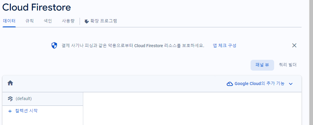 파이어베이스의 데이터베이스를 사용하기 위해서 Firestore Database를 생성 하여야 한다.