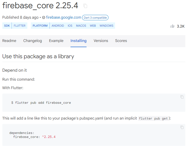 파이어베이스 사용을 위해 firebase_core를 설치 해 준다.