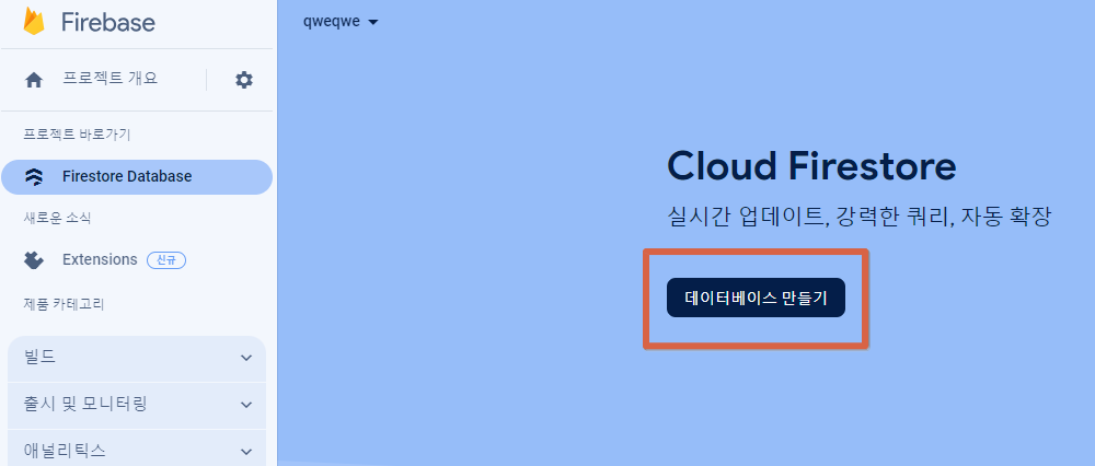 빌드 - Firestore Database - 데이터베이스 만들기 버튼 클릭.