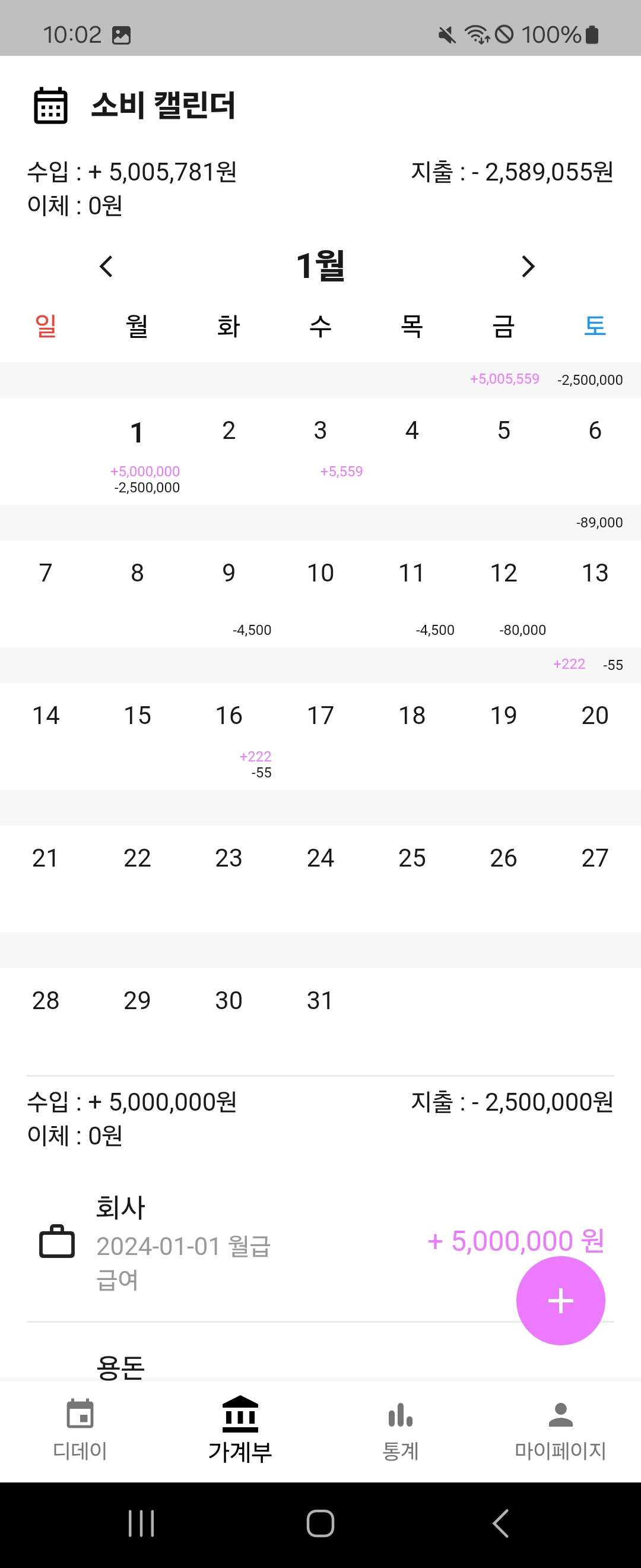 가계부는 아래 사진과같이 상단의 월별 수입,지출,이체 합계, 달력, 하단의 일별 합계, 일별 사용내역으로 구성한다.